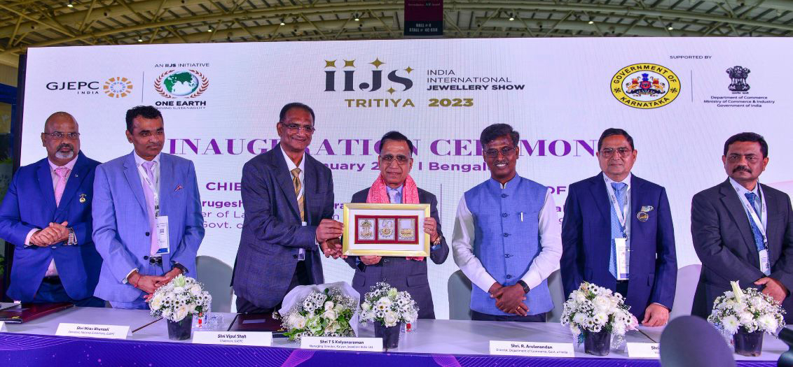 The inauguration of IIJS Tritiya 2023 was graced by Dr. Murugesh R. Nirani, Minister for Large and Medium Industries, Government of Karnataka (Chief Guest); and Shri T. S. Kalyanaraman, Managing Director of Kalyan Jewellers (Guest of Honour); along with Shri Vipul Shah, Chairman, GJEPC; Shri Kirit Bhansali, Vice Chairman, GJEPC; Shri R. Arulanandan, Director of the Department of Commerce; Shri Suresh Kumar Ganna, President, Jewellers Association Bengaluru; Shri Nirav Bhansali, Convener, National Exhibitions, GJEPC; Shri Sabyasachi Ray, ED, GJEPC along with others.