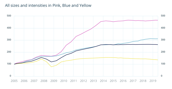 In comparison to the corresponding quarter in 2018, the Q3 FCDI indicates that the Fancy Vivid Blue 2 ct category increased by 6.9%, the Fancy Vivid Yellow 8 ct category decreased by 9.5% and the Fancy Vivid Pink 5 ct category showed an increase of 5%.