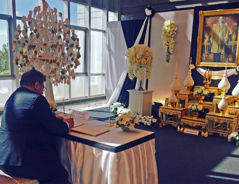 CIBJO President Gaetano Cavalieri (left), signing the memorial book for King Bhumibol Adulyadej of Thailand, who died in October 2016 and still is officially being mourned, during his visit to the Ministry of Commerce in Bangkok