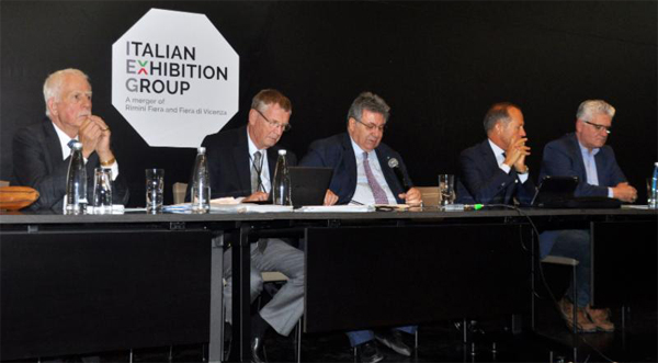 CIBJO's senior officers during the General Assembly session on the final day of the 2018 congress (from left): Roland Naftule, Vice President; Marc-Alain Christen, Chief Financial Officer; Gaetano Cavalieri, President; Corrado Facco, Vice President; and Eli Avidar, Vice President.