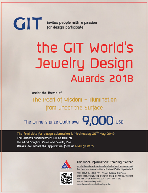 GIT will announce the winners of the contest on September 10, 2018 and the design of the finalists will be made into jewelry to be exhibited at the 62nd Bangkok Gems & Jewelry Fair that will be held from September 7 to 11, 2018 at Challenger Hall, IMPACT, Muang Thong Thani.