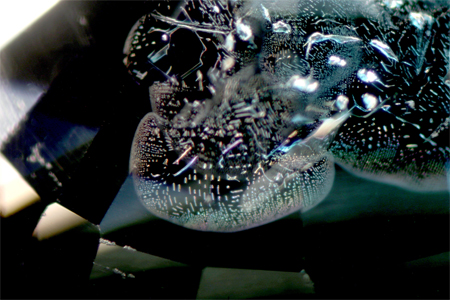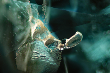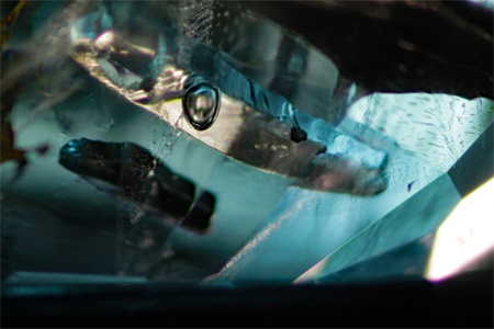 These stones had been tested with both standard and advanced gemological instruments. The standard testing revealed the RIs 1.555–1.560 (birefringence 0.005), doubly refractive, uniaxial positive (DR,U+), SG of 2.59–2.63, and inert to long- and short-wave UV radiation. Therefore, the most prominent characteristic was their strong dichroism in greenish-blue and light greenish-yellow (Figure 2). Microscopic observation showed various inclusion features, such as ‘fingerprints’, negative crystals, and two-phase inclusions (Figure 3). Furthermore, the chemical data obtained are consistent with the formula of Laurentthomasite. The Raman spectrum indicates a close association with milarite.