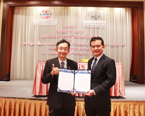 Mr Somchai Phornchindarak, President of the GJPCT (left) and Mr Suttipong Damrongsakul, President of the TGJTA (right), announce their success in persuading the Thai government to approve tax measures that will drive forward the country’s gems and jewelry industry towards its goal of becoming Asia’s gems and jewelry hub