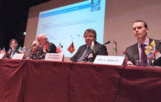 CIBJO President Gaetano Cavalieri (second from right) during the opening session of the 15th Rendez-Vous Gemmologiques de Paris. He is flanked (from left) by Marcelo Ribeiro, CEO of the Belmont Group in Brazil; Gérard Atlan, President of the Commerce Council of France and the French Laboratory of Gemmology, and also a CIBJO Board Member; Didier Giard, President of the Association Française de Gemmologie, the meeting's organiser; and Bruce Bridges, President of Bridges Tsavorite in the United States and Kenya.