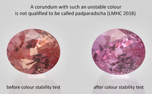 During the meeting, the LMHC members agreed to modify infosheet No. 4, concerning the use of the term "padparadscha." The infosheet now specifies that the term is not applicable if the colour of the stone is unstable and shifts to pink when exposed to a colour stability test (see Figure 1). Additionally, a new infosheet about organic fissure-filling in any gemstone (IS No. 12) and an infosheet about hydrophane opal (IS No. 13) were unanimously approved by the laboratory representatives.