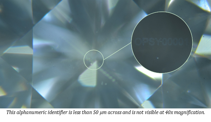 The Opsydia System uses a high-precision, ultrafast laser to place logos, alphanumeric sequences or coded shapes (known as identifiers) beneath the surface of a diamond. This laser is tightly focused only once it passes the surface of a diamond, therefore only creating the identifier at a selected depth without affecting the surface condition or polish. It can be applied beneath the surface of a diamond in a range of locations, such as the table or a specific facet.