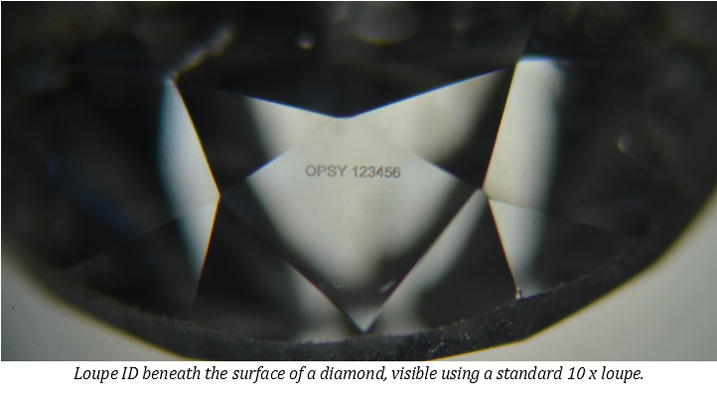 In contrast, a Loupe ID is larger and denser and can be used in strategic places, such as the centre of the table, to allow valuers, grading houses and consumers to quickly distinguish laboratory-grown or branded items from natural diamonds. This group of identifiers is so named because of their visibility using a standard 10x loupe and can be placed at depths of up to 0.25 millimetres (250 microns) beneath the surface of a diamond.