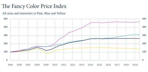 The Fancy Color Diamond Index is published by the non-profit Fancy Color Research Foundation (FCRF), tracking pricing data for Yellow, Pink, and Blue fancy color diamonds in major global trading centers – Hong Kong, New York, Geneva and Tel Aviv.