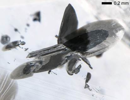 A close-up view of a metallic inclusion. The inclusion is reflective/silver in appearance, surrounded by a black, graphite-bearing decompression crack. Image is 2.56 mm wide. Photo by Evan Smith; © GIA