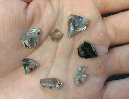 Assortment of diamond offcuts used in the study. The largest is 9.6 carats. These diamonds could be analyzed by destructive means (polishing to expose inclusions) whereas many other diamonds studied were polished gemstones that were only borrowed and studied non-destructively. Photo by Evan Smith; © GIA
