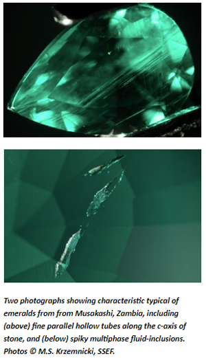 The batch of 10 emeralds submitted to SSEF had a total weight of approximately 5 carats. Nine of them displayed classic features of Zambian emeralds from the Kafubu area, such as mica flakes, amphibole inclusions and rectangular 2-phase inclusions. But the anomalous stone revealed features previously described in emeralds from Musakashi.