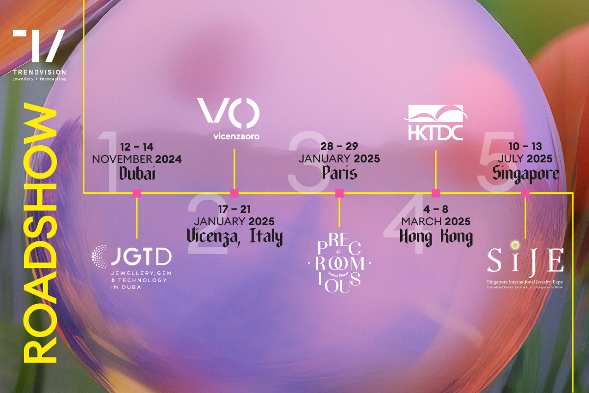 Starting from Vicenzaoro, the international jewellery and watch show organised by Italian Exhibition Group in Vicenza, where the new TRENDBOOK is launched every year in September, the Trendvision Jewellery + Forecasting events will touch down in the jewellery capitals of the world: Dubai (JGTD, 12-14 November 2024), Vicenza (VOJ, 17-21 January 2025), Paris (Precious Room by Mp, 28-29 January 2025), Hong Kong (HKTDC International Jewellery Show, 4-8 March 2025), Singapore (SIJE, 10-13 July 2025).